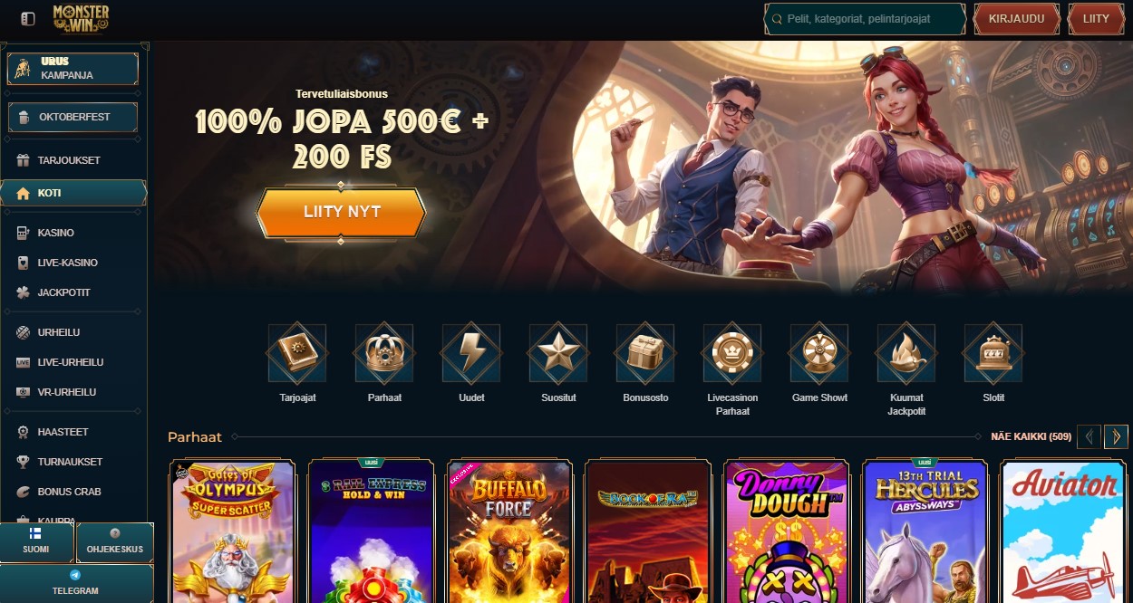 MonsterWin näyttää arcade-peliltä, jonka on piirtänyt huippuluokan sarjakuvataiteilija. Mustat paneelit. Neon-korostukset. Tarkat hirviöikonit upotettuina painikkeisiin. Astut aulaan ja estetiikka iskee heti. Slotit ovat pääosassa. Urheilu elää samassa teemassa. Kaikki on nopeaa ja silti puhelimesta helposti luettavaa.