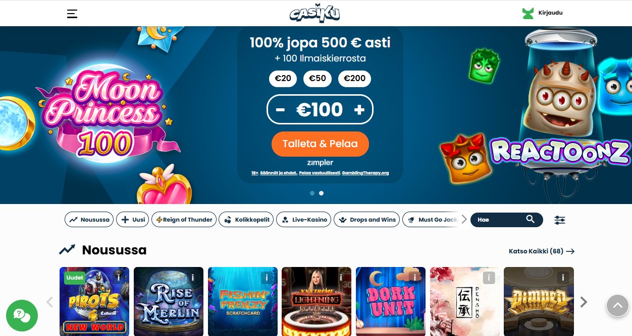 Casiku pitää fokuksen peleissä ja ajassa. Se on nopea, siisti ja helppo navigoida. Valikoima on laaja muttei sekava, ja live-puoli toimii, kun haluat vaihtelua rytmiin. Maksutavat sopivat yleisiin tottumuksiin ja tuki on läsnä tuputtamatta.