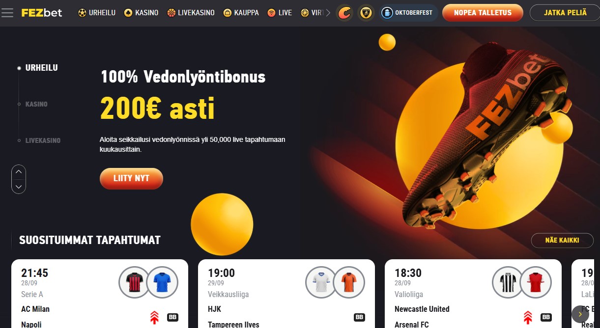 FezBet tarjoaa monelle mieluisan “yksi tili, kaikki pelit” -ratkaisun: selkeä kasinon tervetulotarjous 200 kierroksella, live-pöydät isoilta studioilta sekä vedonlyönti, joka kattaa suositut lajit ja e-urheilun runsaalla live-tarjonnalla. Huomioi kuitenkin lisenssitilanne Curaçaon rekisterissä ja kierrätyksen laskentatapa. Jos maasi sivulla lisenssi on kunnossa ja ehdot sopivat tyyliisi, FezBet voi olla viihdyttävä kokonaisuus. Jos ei, seuraa tilannetta ja palaa, kun lisenssikuva selkenee.