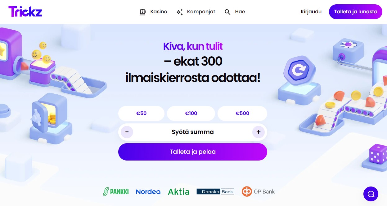 Trickzin iloinen kasinoteema tulee vastaan heti, kun sivu avautuu. Värikkäät kortit vaaleaa taustaa vasten, pehmeät liukuvärit. Painikkeet ovat puhelimella juuri siellä, missä peukalot haluavat. Brändi korostaa nopeaa viihdettä raskaiden kromikoristeiden sijaan. Pari riviä vieritystä ja olet jo valitsemassa slottia. Pääroolissa ei ole urheilu, mutta kasinoruudukko ja live-huoneet säilyttävät kautta linjan saman siistin ilmeen. Useat arvostelijat kutsuvat Trickziä Suomi-suuntaiseksi Pay N Play -tyyppiseksi sivustoksi, mikä selittää nopeat siirtymät ja minimalistiset polut.