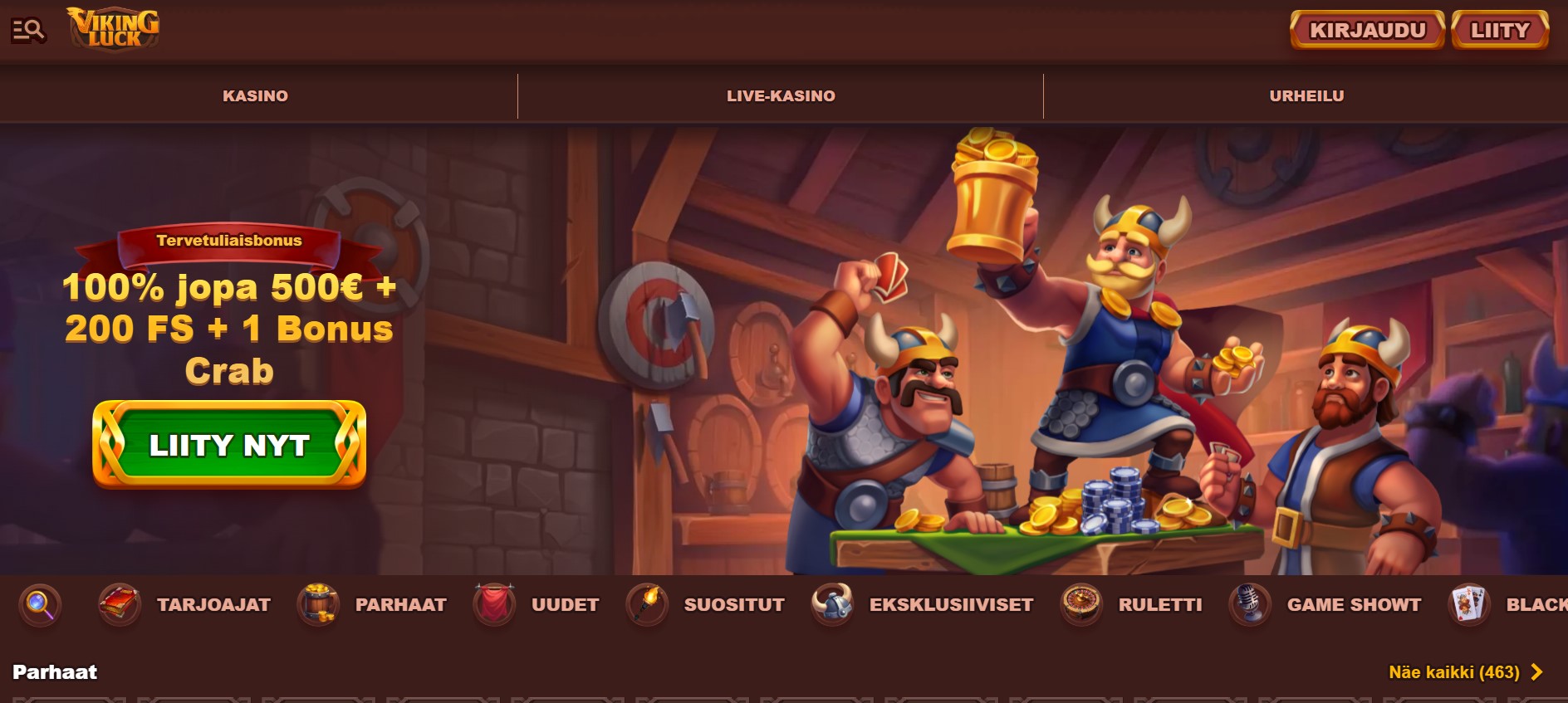 Haluatko lähteä eeppiselle kasinoretkelle? VikingLuck tarjoaa vahvan viikinki-/norjalaisteeman, joka ei yritä häikäistä melulla. Sivusto avautuu tummasävyiseen, siistiin aulaan, jossa pelien grafiikka saa puhua puolestaan. Nimet ovat selkeitä, laatat isoja ja hakukenttä ymmärtää puoliksi kirjoitetut pelien nimet. Kahdella pyyhkäisyllä löydät jo jotain fiilikseen sopivaa. Tuntuma on tehty lyhyisiin, säännöllisiin pelituokioihin, ei kerran vuodessa -vierailuun.
