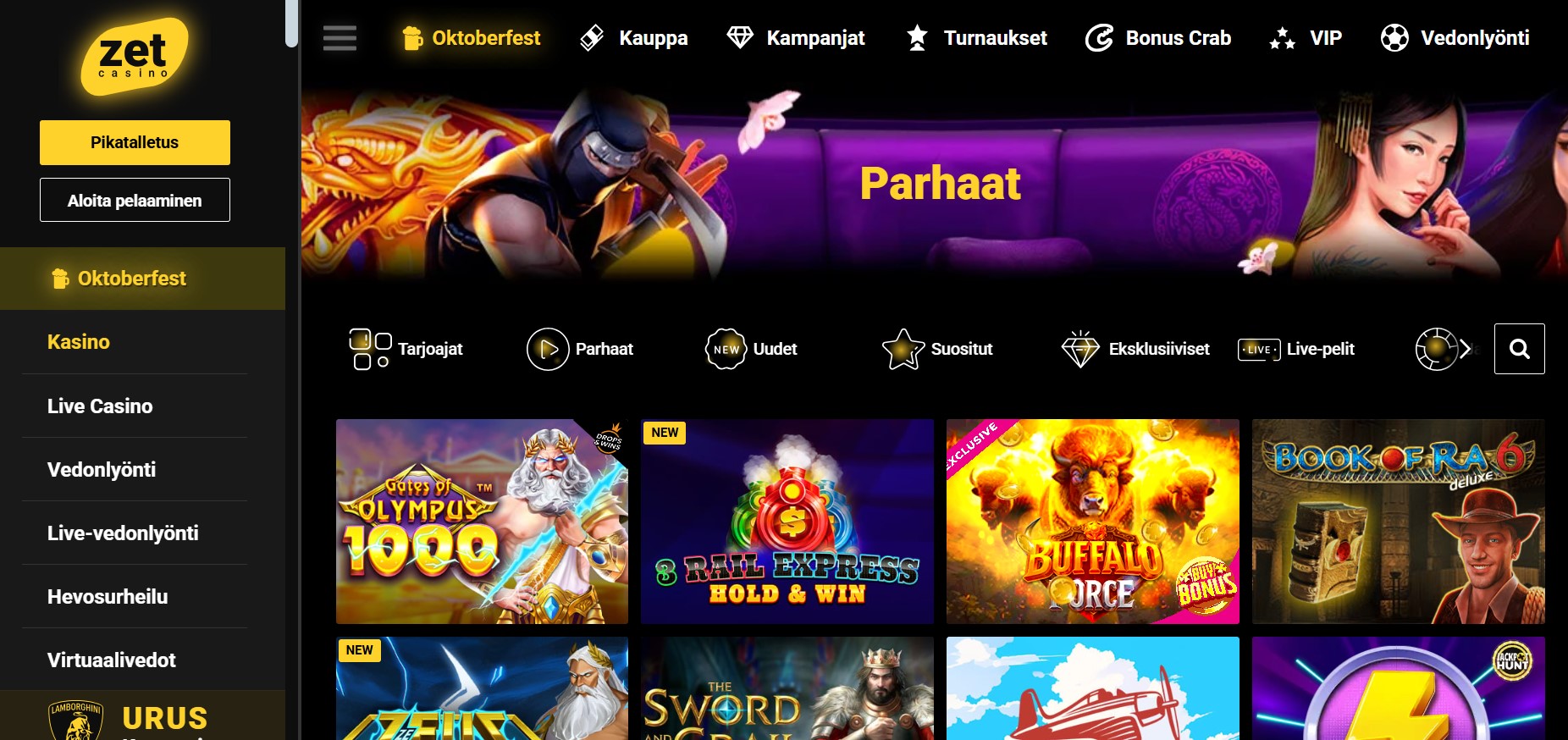 ZetCasinossa on 2 000+ peliä, ja aluekohtaiset valikot kasvavat reilusti tätä suuremmiksi, kun studioita lisätään. Slotit, pöytäpelit, live-huoneet ja ”instant play” ovat saman sivun alla. Käytä ensin pelintarjoajasuodatinta ja kiinnitä suosikit, jotta ylärivistä tulee viikon loppuun mennessä ”sinun juttusi”. Arjen luottopelit löydät esimerkiksi Pragmatic Playlta ja Play’n GO:lta, selkeät grafiikat Quickspiniltä ja Thunderkickiltä, terävämmän matemaattisen profiilin Hacksaw’lta ja BTG-tyylisiltä peleiltä, ja live-lattian ankkurina toimii Evolution, alueesta riippuen myös Ezugi ja muita. Jos tavoittelet progressiivisia jättipotteja, avaa kunkin pelin info ensin – osa verkoista vaatii tietyn panoksen päästäkseen ylimmälle tasolle, eikä jokainen slotti kerrytä suurinta pottia.